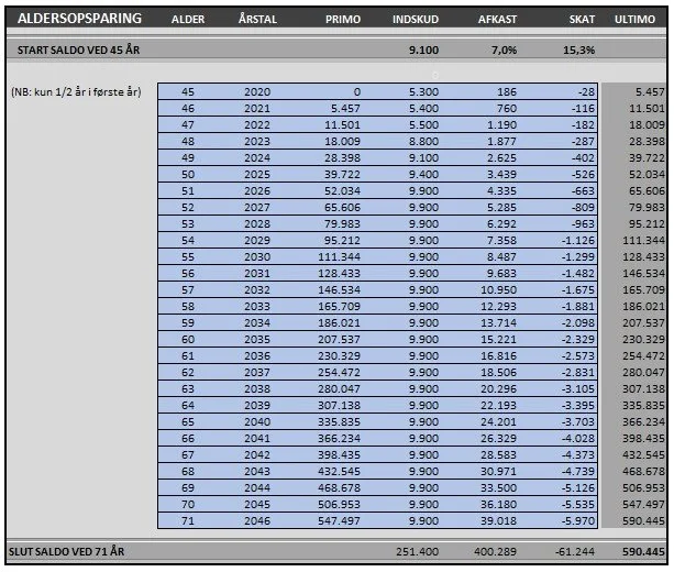 Når jeg når pensionsalderen, har jeg således ca. 590.000 DKK, som jeg kan trække ud skattefrit.