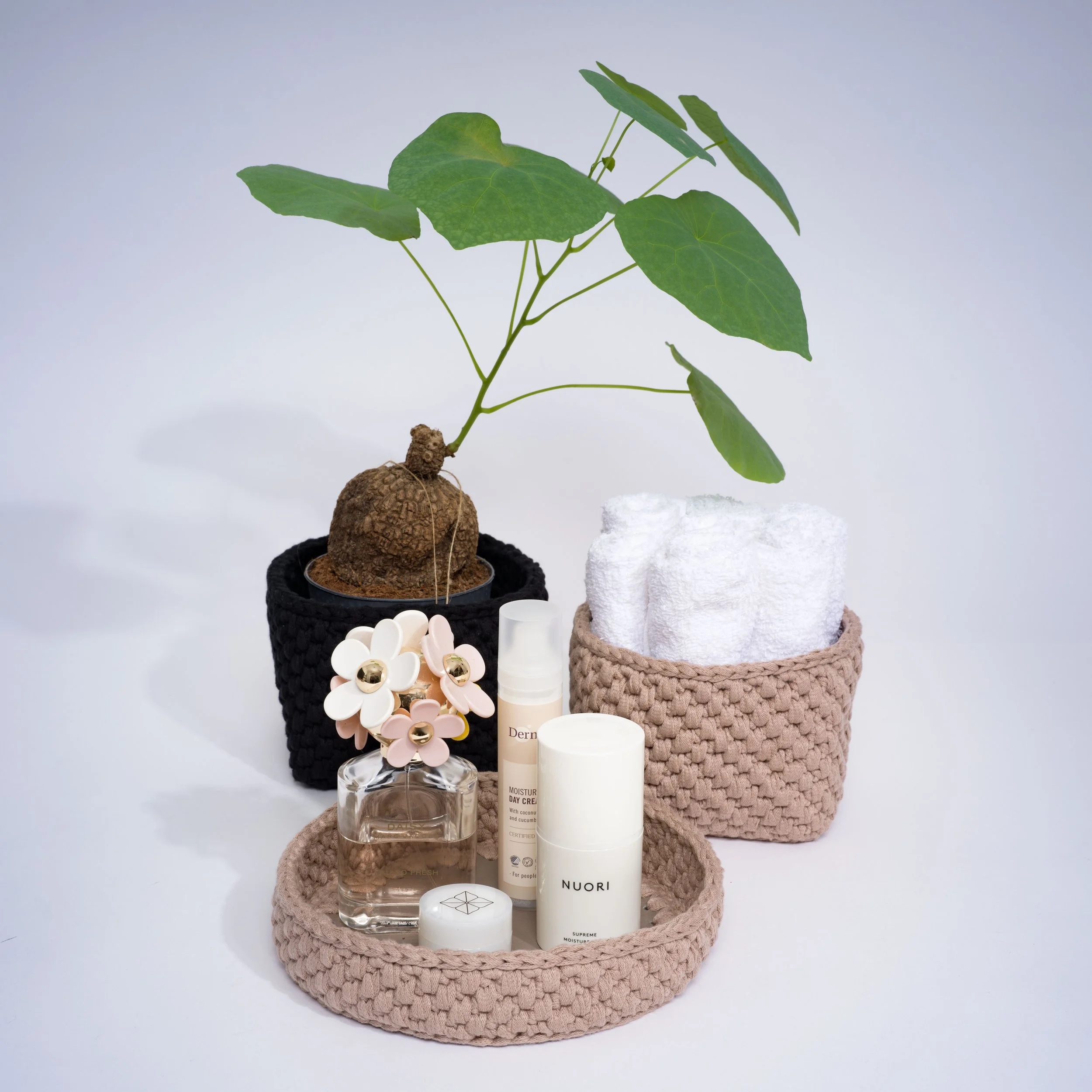 Hæklet bakke med bund af vegansk læder. Lille 22 cm i diameter og 4 cm høj.